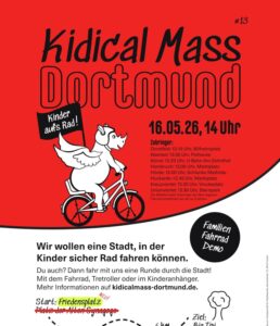 Alle Infos gibt’s auf https://kidicalmass-dortmund.de/. Wer in der Kita, in der Schule, auf dem Spielplatz oder im Bekanntenkreis Werbung machen möchte kann hier kostenlos Flyer und Plakate bestellen.